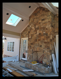 A new contemporary home has angled great room windows to take advantage of river views winding around the house below and mountain views above. Decks, still under construction will extend living spaces to the outdoors on the side and rear of the house.